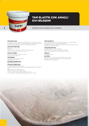 pozitif ve negatif su basıncına karşı yalıtım malzemesi olarak kullanılır. Yüzeydeki önemli bozukluk ve delikler, sıvı bileşen uygulamasından min. 24 saat